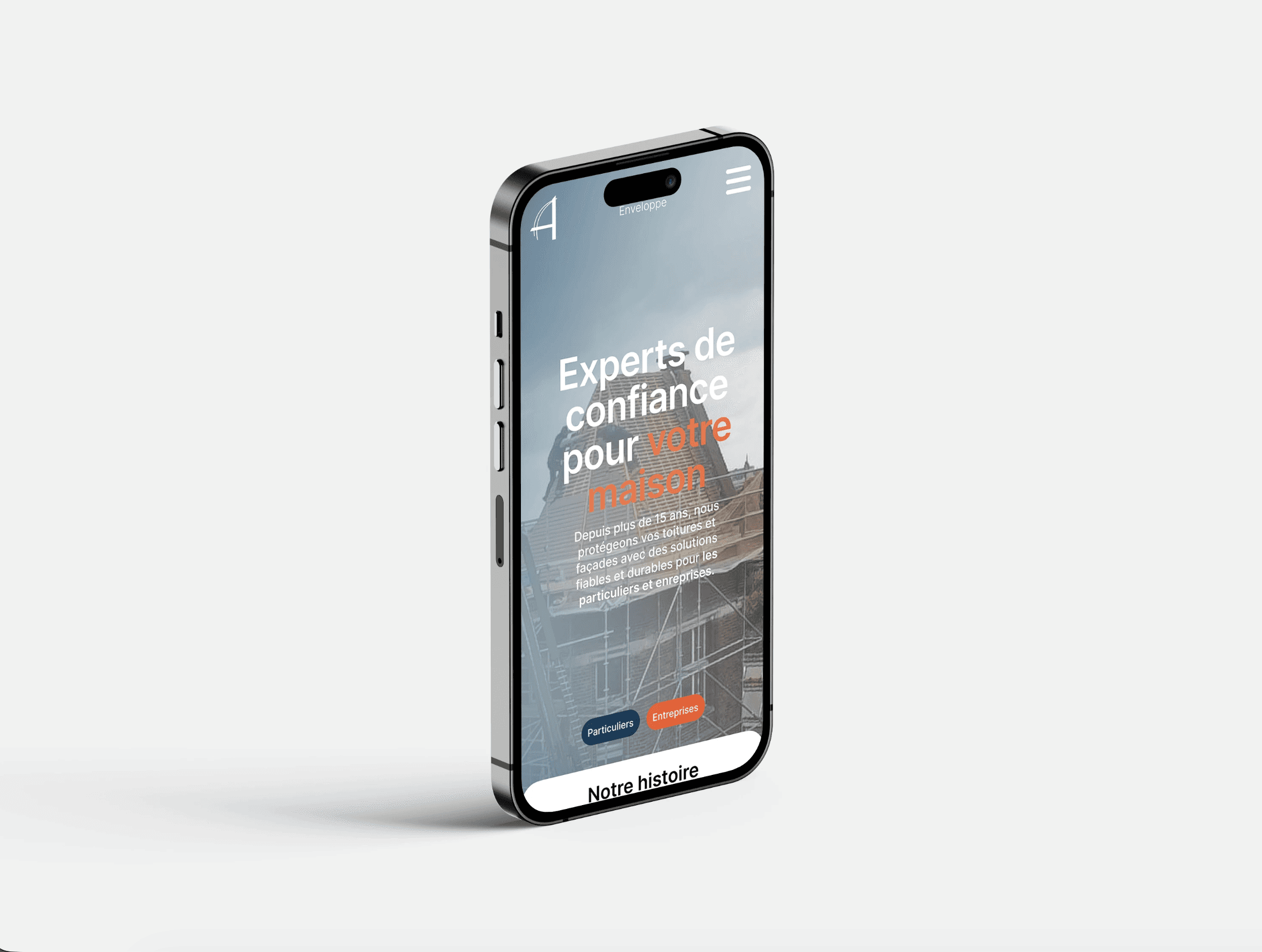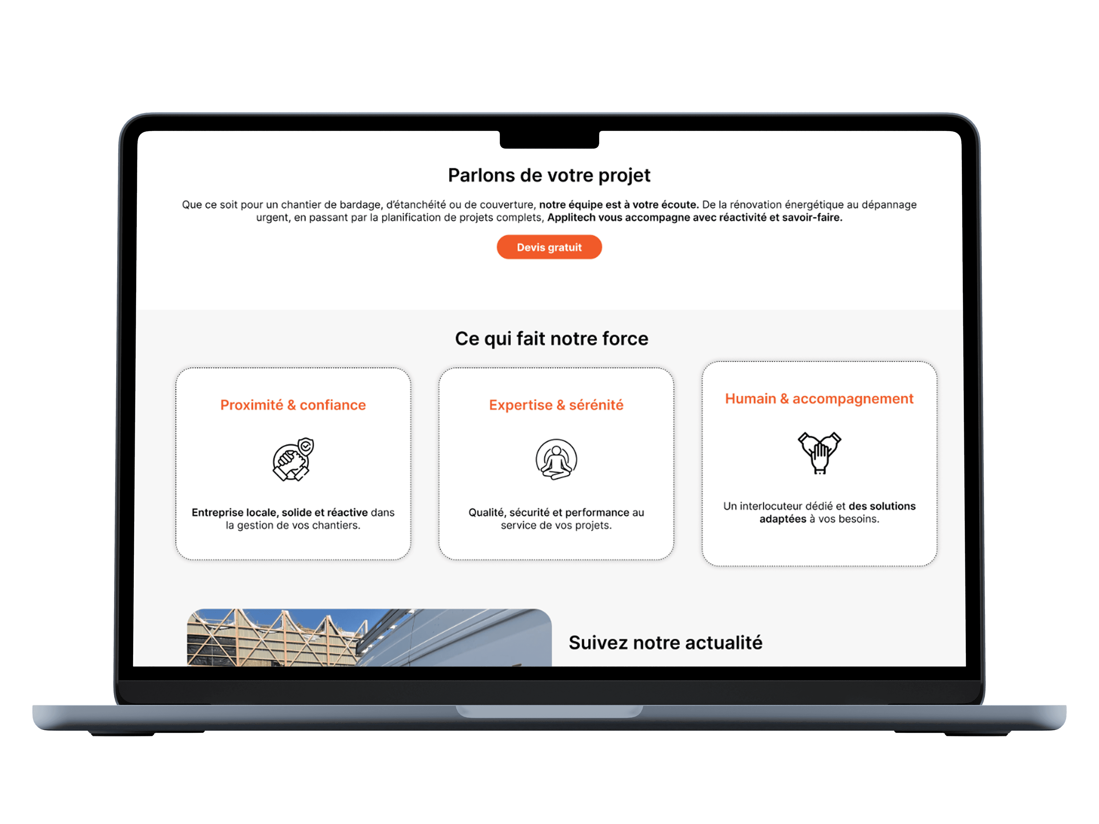 Création d'un site vitrine pour une entreprise de couverture, étanchéité et bardage. Le client, jusqu'ici orientait principalement vers une clientèle professionnelle (BtoB), et souhaite élargir son activité auprès des particuliers (BtoC). L'enjeu était donc de concevoir un site vitrine permettant de parler à ces deux cibles distinctes. Nous avons proposé une homepage structurée autour de ces deux parcours : une dédié aux entreprises et une autre aux particuliers. Le discours et l'interface ont été adaptés à chaque audience : mise en avant de la fiabilité et des références pour les professionnels, accompagnement et proximité pour les particuliers.