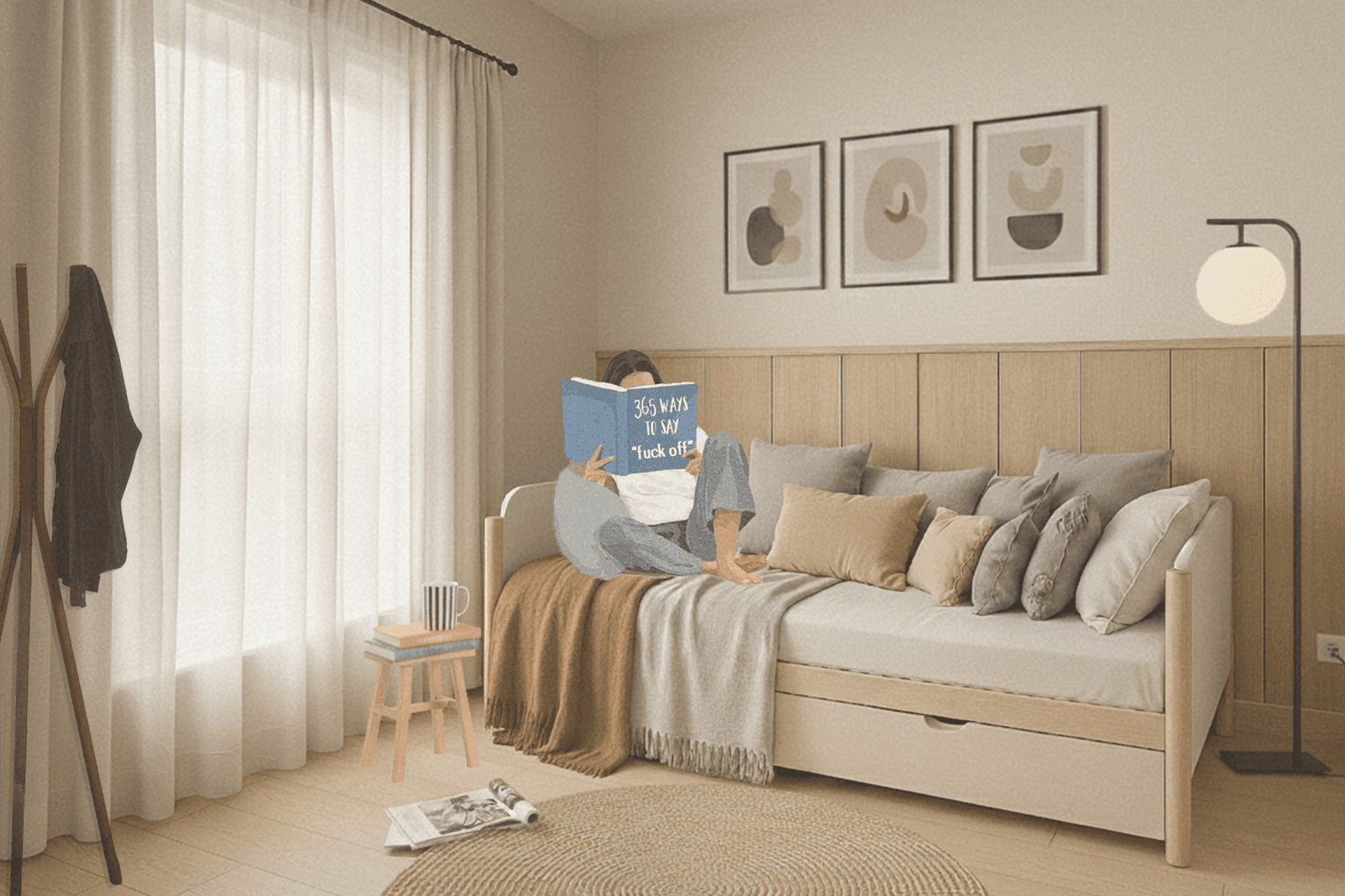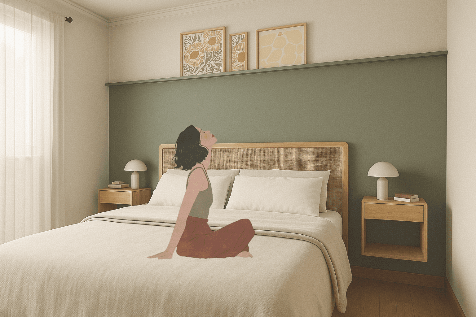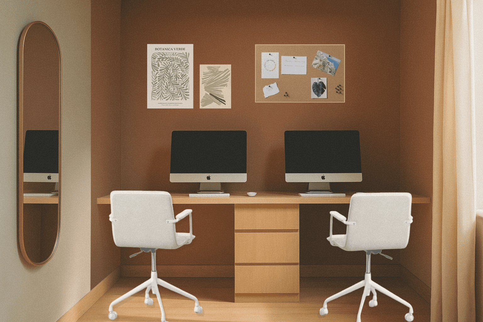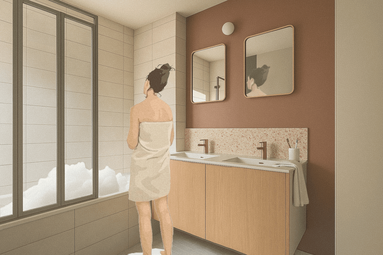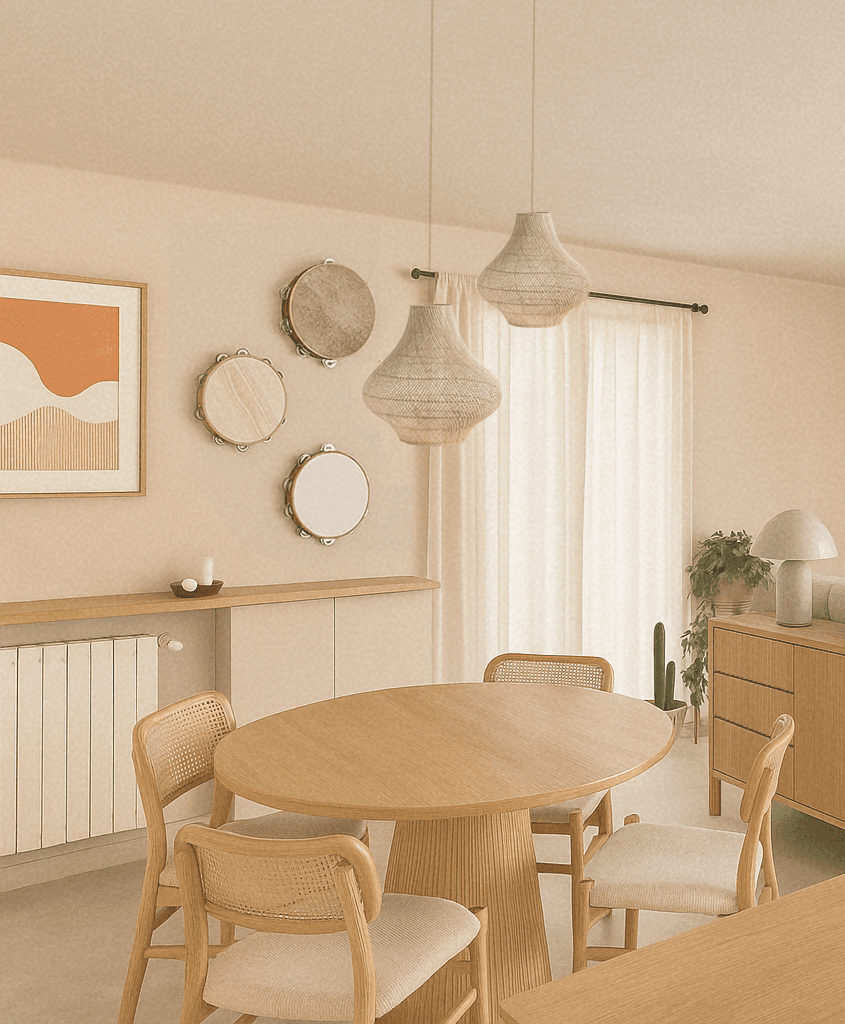 Pour leur premier projet immobilier, nous avons accompagné un jeune couple dans la conception d’un intérieur à la fois simple, fonctionnel et accueillant, pensé comme un véritable lieu de vie. L’aménagement repose majoritairement sur du mobilier issu du commerce, complété par la possibilité de personnalisation et de créations DIY, afin de permettre au couple d’y apporter sa touche personnelle au fil du temps. Une attention particulière a été portée au choix et à la répartition des couleurs dans l’ensemble des espaces, avec la volonté de créer et de distinguer différents sous-espaces grâce à la peinture murale. Les clients ont ainsi privilégié une palette dominée par des teintes chaudes, telles que le terracotta. La cuisine, déjà définie par des meubles en finition vert clair, a servi de point de départ au projet. L’association du vert d’eau et du terracotta crée une harmonie douce et naturelle, tout en structurant visuellement l’ensemble du rez-de-chaussée. À l’étage, l’aménagement comprend deux chambres et un bureau. La chambre parentale a été imaginée dans des nuances de vert, apportant à la fois sérénité et caractère. La seconde chambre a été conçue comme un espace évolutif, capable de s’adapter aux besoins futurs. Le bureau, quant à lui, a été pensé comme une pièce polyvalente : il intègre le mobilier existant tout en laissant la liberté de réaliser un bureau sur mesure en DIY, et peut également se transformer en chambre d’appoint pour accueillir des invités. L’ensemble du projet a été conçu dans une recherche d’équilibre entre esthétique, fonctionnalité et personnalisation, afin de créer un intérieur fidèle à la personnalité du couple et évolutif dans le temps.